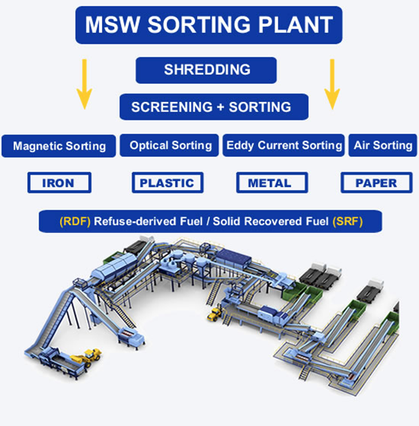 For Regions with Mixed Waste Collection: We engineer robust "Dirty MRF" or Mixed Waste Processing solutions. These facilities are designed to handle the full spectrum of MSW. The initial focus is on the efficient removal and potential valorization of the organic fraction (using screens and digesters/composting). The remaining dry fraction is then processed through a cascade of sorting technologies to recover all possible valuables. This approach significantly reduces landfill dependency and can include refuse-derived fuel (RDF) production from non-recyclable residues.